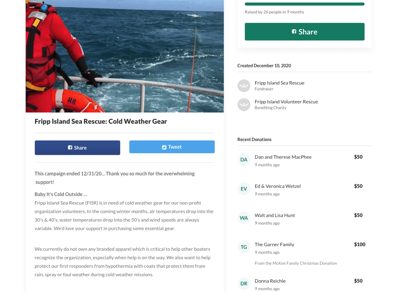 I regularly volunteer with South Carolina-based nonprofit, Fripp Island Sea Island Rescue (FISR). In 2021, I concepted and led the organization’s first GoFundMe campaign to help raise funds for cold weather gear for the boating rescue first responders. I also created an online auction site for FISR’s first-ever online auction, which reached 192% of its fundraising goal in its first year. I am also responsible for the organization’s website and social media.